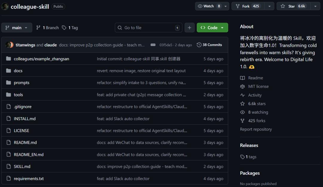 起初,这似乎只是程序员群体中常见的一种极客式幽默。有人在 GitHub 上发布了一个名为「同事.skill」的项目。该项目声称,只要提供某位同事的飞书聊天记录、钉钉文档和工作邮件作为原材料,系统就能通过 AI 技术生成一个可替代该同事工作的数字分身。这个看似荒诞的项目在短短 5 天内狂揽了 6.6k 颗星。随后,这股风潮迅速破圈,蔓延至小红书、微博等社交平台。