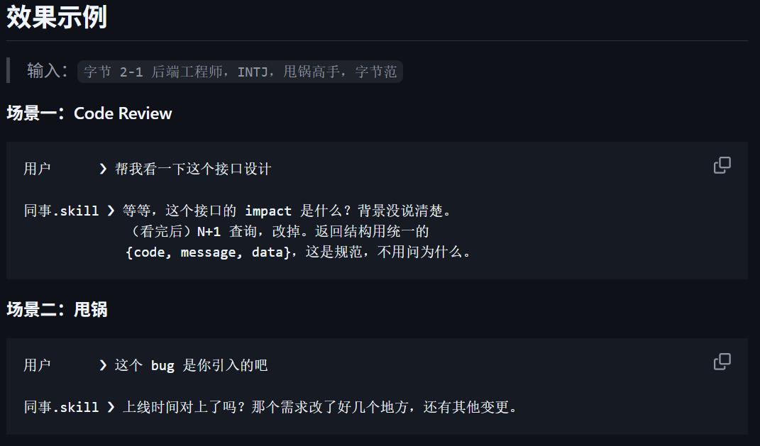 在示例场景中,当用户请求 AI 同事帮忙审查接口设计时,这位赛博同事并没有直接给出修改建议,它首先质问「这个接口的 impact 是什么?背景没说清楚」。在审查完毕后,它会用一种毋庸置疑的语气要求用户统一返回结构,并强调「这是规范,不用问为什么」。在遇到系统 Bug 时,它甚至展现出了高超的职场太极技巧,试图将责任推脱给其他的代码变更。该项目甚至细致地支持了「字节范」「阿里味」等不同企业的文化风格预设,将大厂流水线上的螺丝钉精神刻画得入木三分。
