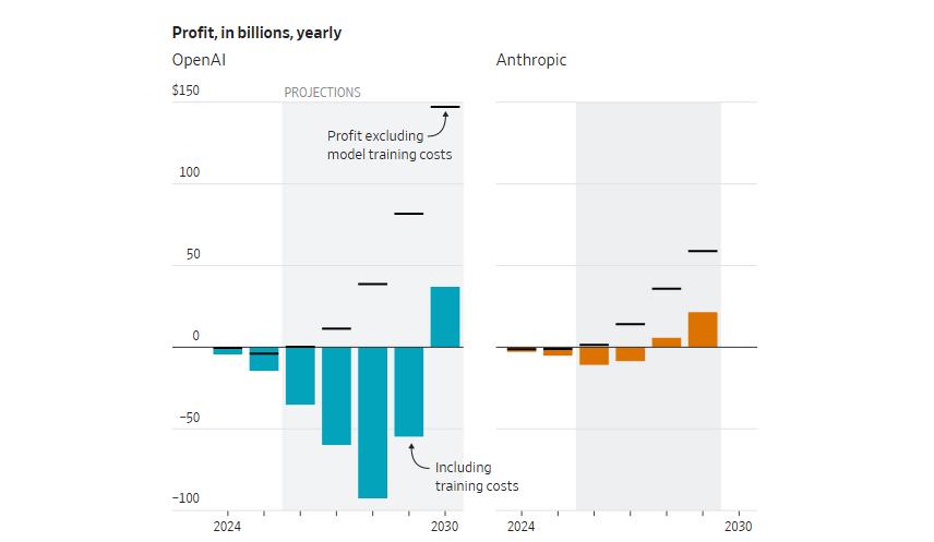 根据《华尔街日报》统计的数据,即便包含训练成本(柱状图),Anthropic在2028年就能实现盈利,而OpenAI需要到2030年;而如果不包含训练成本(线图),Anthropic在2024和2025年就基本实现盈亏平衡。