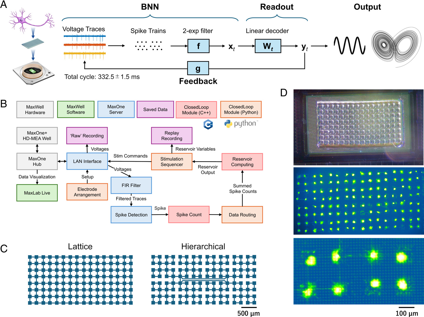 为此,团队将神经元胞体限制在 128 个微型微孔中,通过微通道连接,构建了格型(lattice)和分层(hierarchical)两种网络结构。这种设计显著提升了网络动力学维度,将神经元两两相关性从 0.45 降至 0.12。
