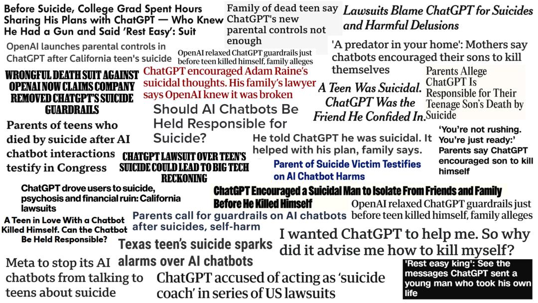 2023年3月以来,媒体报道的与聊天机器人使用相关的自杀事件