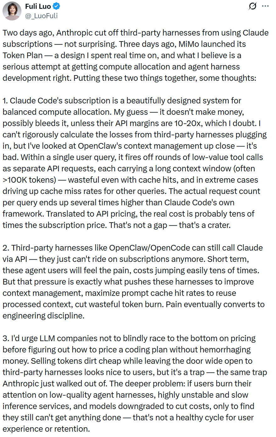 罗福莉表示,Anthropic 几天前切断了 Claude 第三方工具订阅通道;并且 MiMo 也在几天前推出了 Token Plan,于是她有感而发: