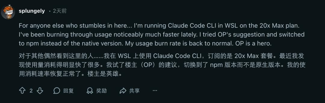有用户留言证实了作者的解决方案。一位在 WSL 环境下运行 Claude Code 的高强度用户表示,自己近期的确感觉额度烧得飞快,在听从作者建议改用 npm 方式安装后,额度消耗速率立刻恢复了正常。