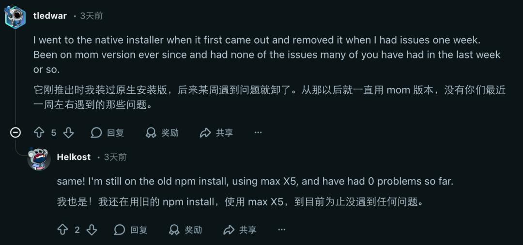也有几个一直使用 npm 方式安装的用户跟帖表示,自己确实完全没有遇到最近大家都在抱怨的这些 Bug。