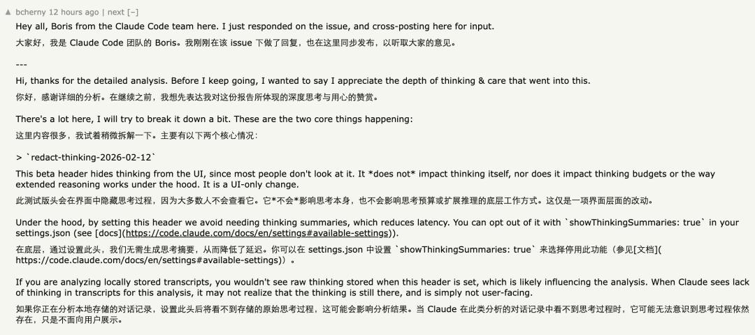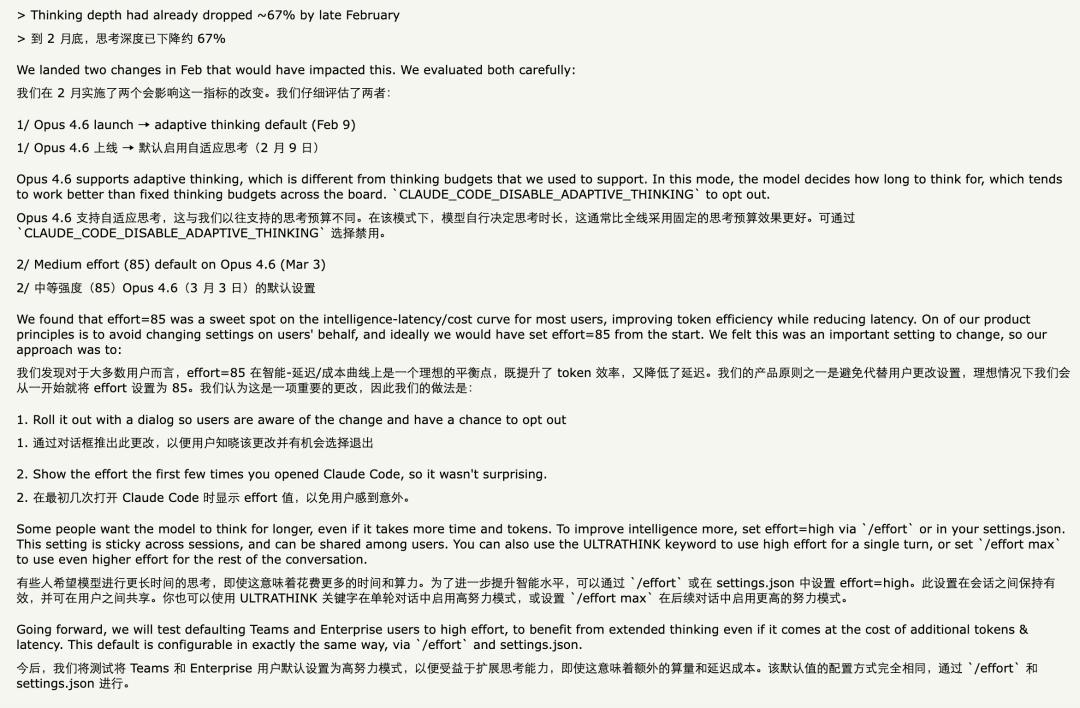 Boris 不得不出面解释,称 redact-thinking 只是 UI 层面的隐藏,并不影响实际推理;真正影响行为的是两处变更 ——2 月引入了让模型自主决定思考深度的「自适应思考」模式,3 月又将默认 effort 级别调为 Medium,他表示用户可以手动调回高强度模式。