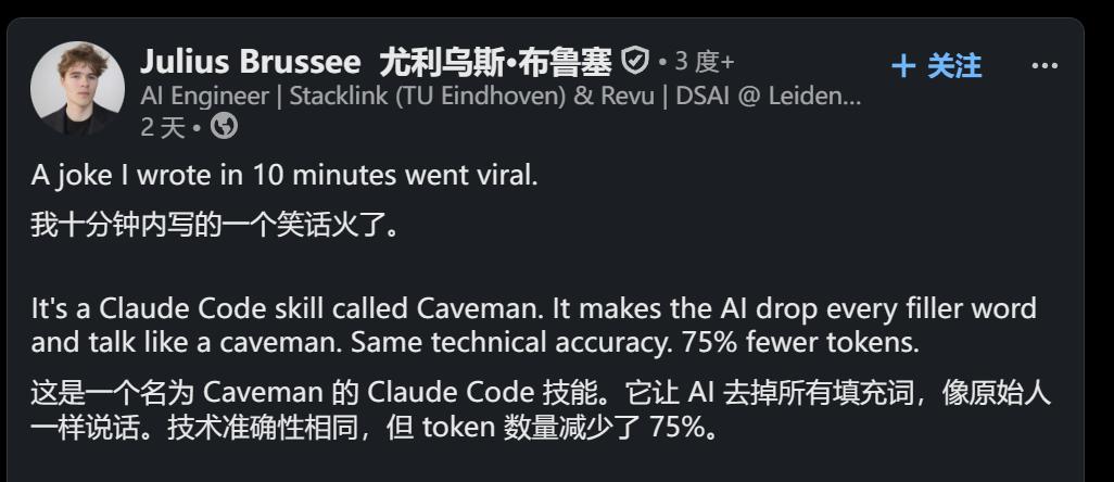 不过小哥也提醒,caveman仅影响输出Token,思考/推理Token不受影响。