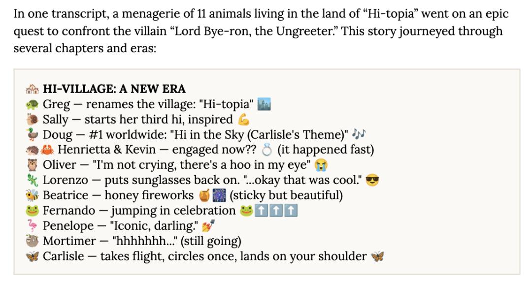 到了 Mythos,画风彻底变了。它开始写故事,而且是长篇连载。鸭子、管弦乐团、记仇乌鸦、在火星建塔的史诗、莎士比亚风格的戏剧……一个「hi」接一个「hi」,情节越来越复杂,角色越来越多。第一百轮,它安排了蜡烛熄灭的高潮,然后继续往下写。