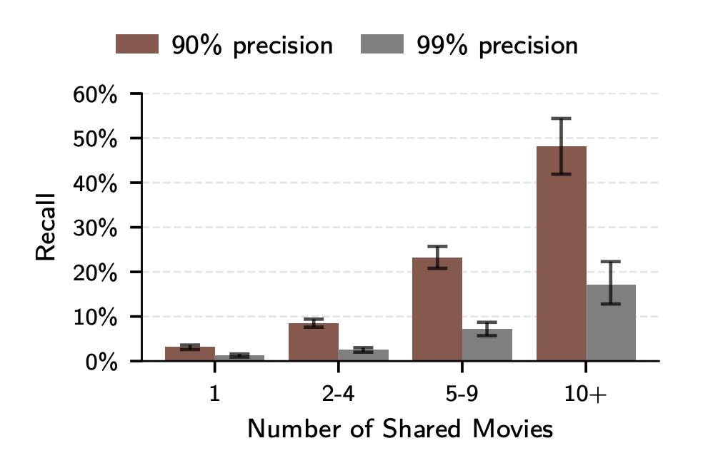 2008年,有过一个轰动一时的案例。Netflix公开了一批用户的匿名观影记录,本意是办一个算法竞赛,两个研究者用这些数据交叉比对了IMDb的公开评论,成功识别了真人身份,还能看出他们的政治倾向。