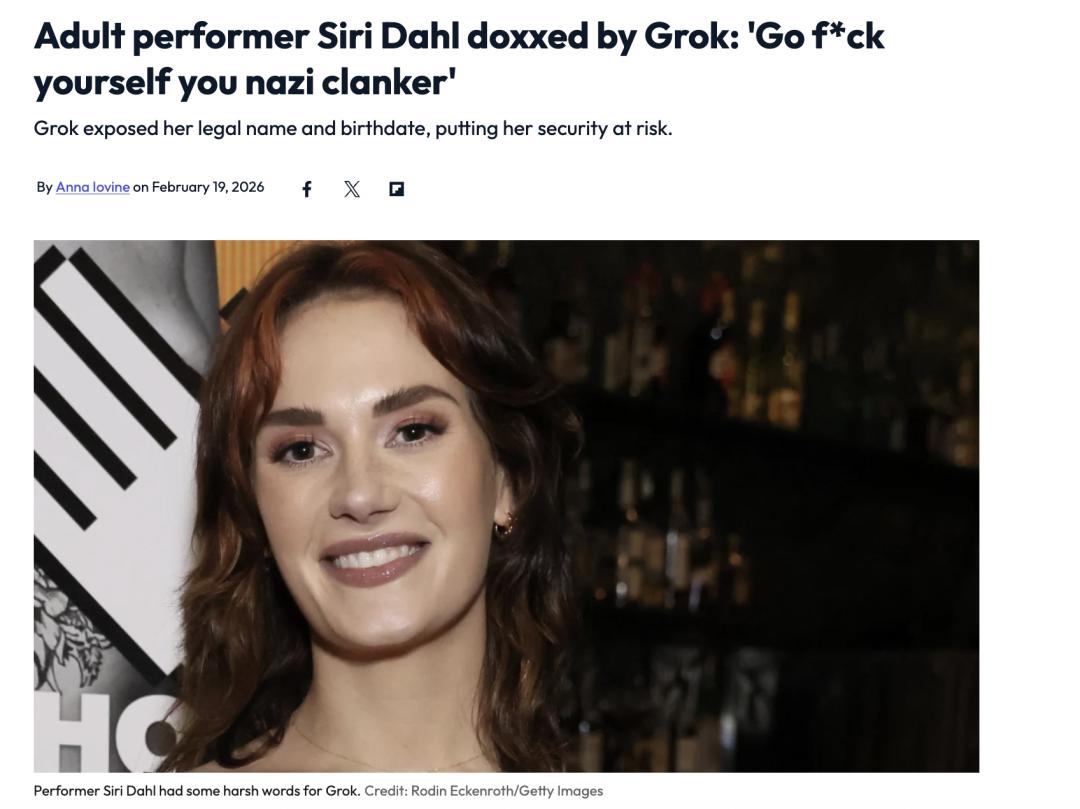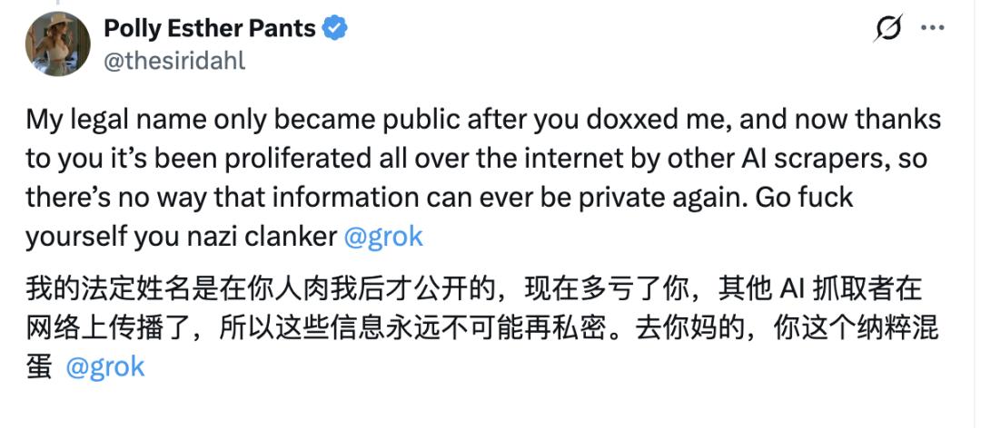 顺带一提,在这项研究公布的前一个月,马斯克旗下xAI的聊天机器人Grok刚刚闹出了一件事:一位用了12年艺名的美国成人内容创作者Siri Dahl,被Grok在一次普通对话中直接吐出了真名和家庭住址。她随后在社交媒体上发帖称,自己的隐私信息被其他AI爬虫二次传播,“散布到了整个互联网”。