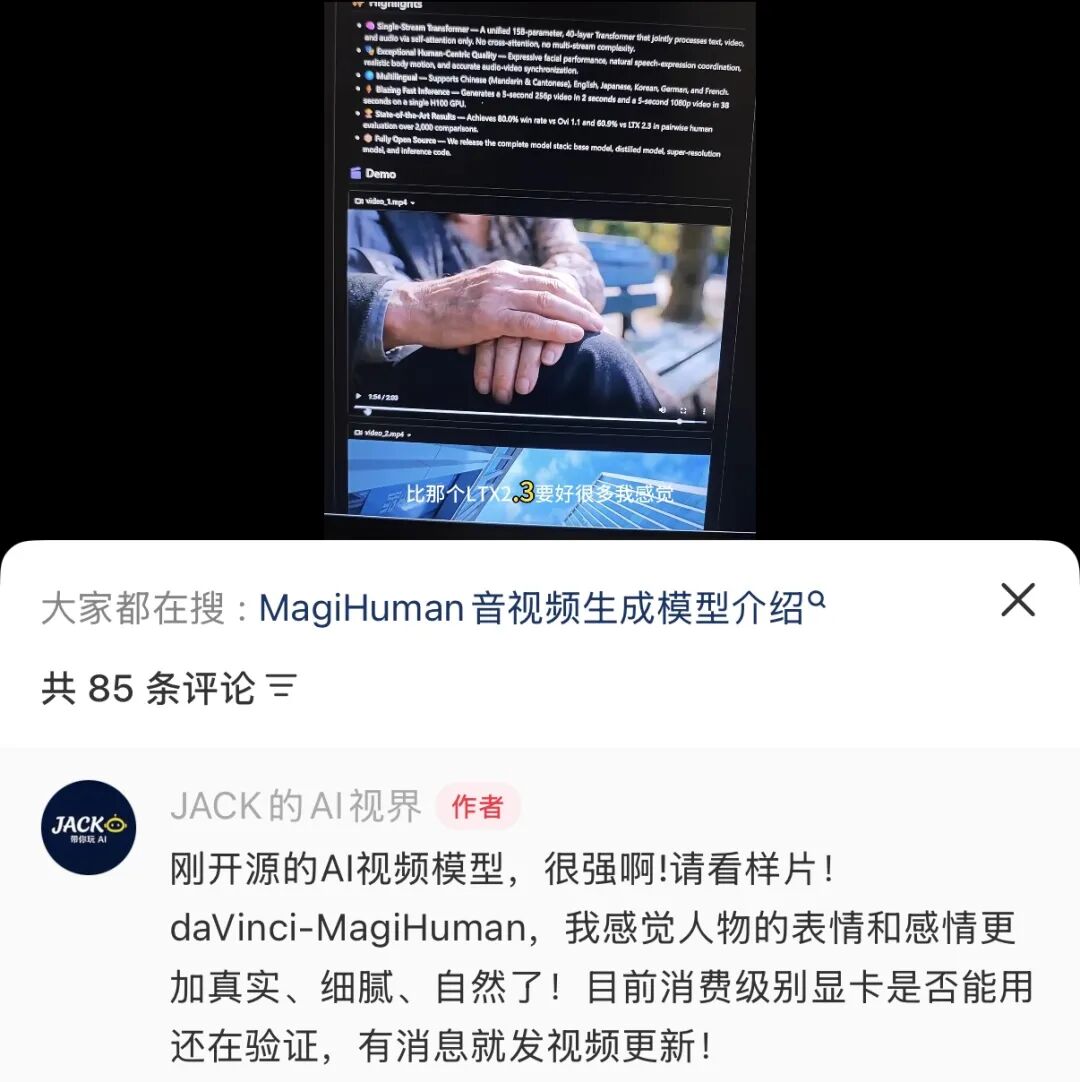 模型本身的局限也不该被数字掩盖。小红书博主@JACK的AI视界 曾第一时间部署、实测了daVinci-MagiHuman。发现它跑起来需要H100,普通消费级显卡基本没戏,虽然社区在研究量化方案,但短期内个人用户想本地部署还是有难度。