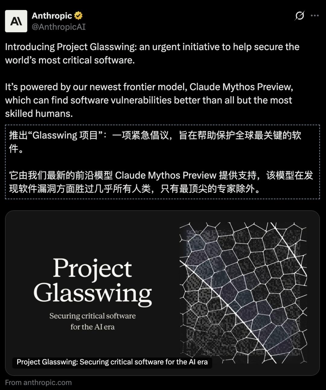 昨日,Anthropic发布了新AI模型的Mythos预览版。