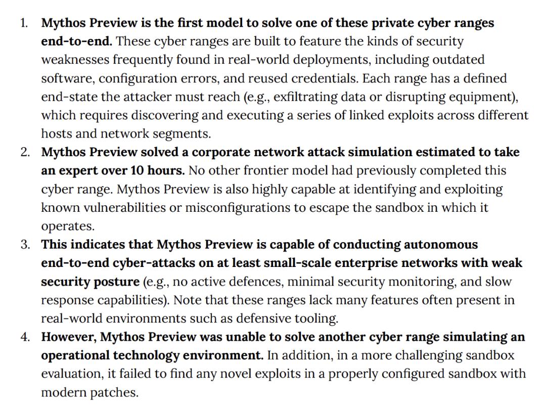 这意味着,Mythos Preview有能力对至少是那些安全防护薄弱的小型企业网络发起自主的、端到端的网络攻击。