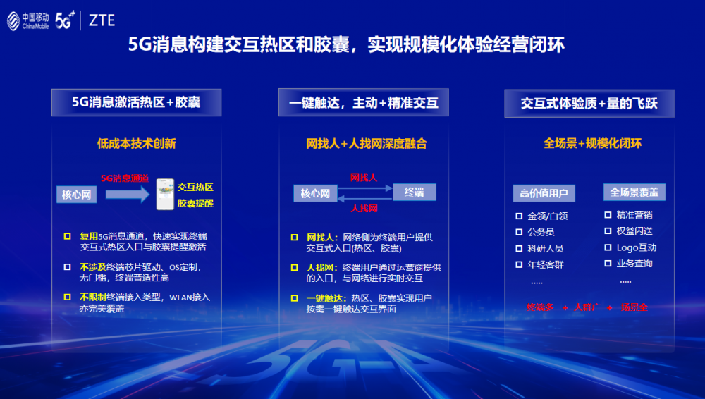 随着运营商网络由流量经营向体验经营升级蜕变,如何依托技术创新构建新质生产力,全面提升用户体验水平,已然成为一个关键性课题。此次,河南移动携手中兴通讯,在充分洞察用户需求、深入分析用户意图的基础上,使用AI用户画像模型精分目标客群,为用户提供内心真正需要的权益和服务,提升用户满意度;低成本复用现网5G消息通道能力,引入浅层交互入口和手机胶囊全新激活方式,不涉及终端芯片驱动和操作系统定制,不限制终端接入类型,普适性极高,为用户与网络侧交互,提供了一种颠覆传统的崭新方式,也是用户最为愿意使用的方式。