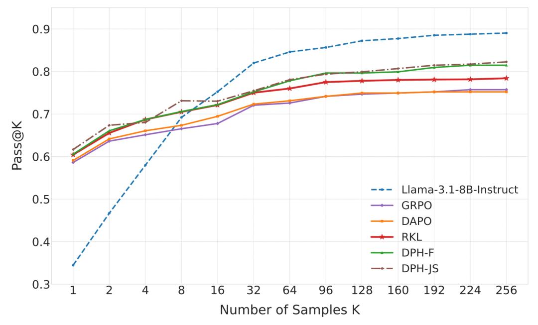 DPH-F与DPH-JS不仅Greedy分数最高,其Pass@8分数也超越了Base Model。其中,DPH-JS的Pass@8分数较GRPO高出4.3%。在更大的k设置下,DPH-RL更接近base model,缓解了Pass@k的崩塌。