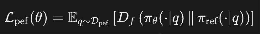近完美集合Dpef:针对模型已基本掌握的样本,πref从Dpef采样,依靠f-divergence保持在正确样本上的多样性。更直观地说,模型在这部分样本上不再追求「获取更高奖励」,而是尽量不偏离原本已表现良好的行为分布,其一般形式为:
