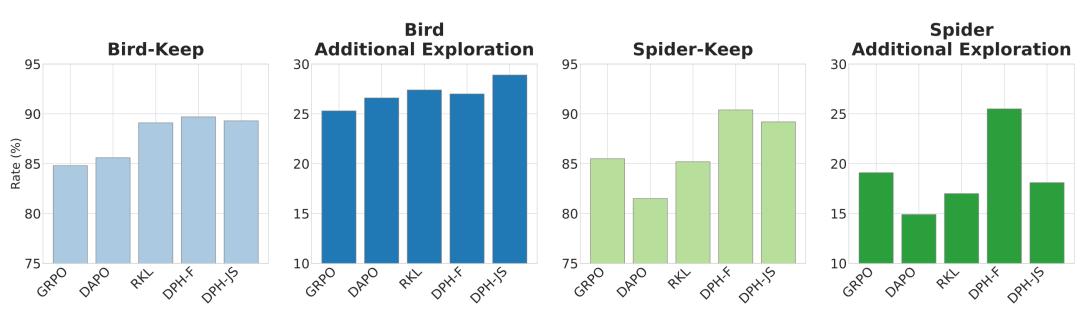 我们将SQL任务上的Spider数据集视为cross-domain,将数学数据集视为out-of-domain。可以看到,所有仅在SQL数据集Bird上训练得到的RL模型,在分布发生偏移时都会出现不同程度的性能下降。