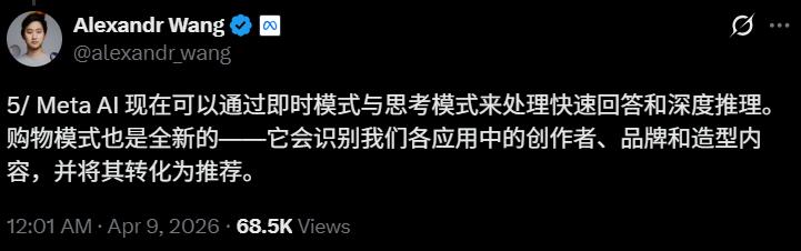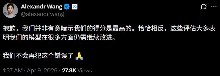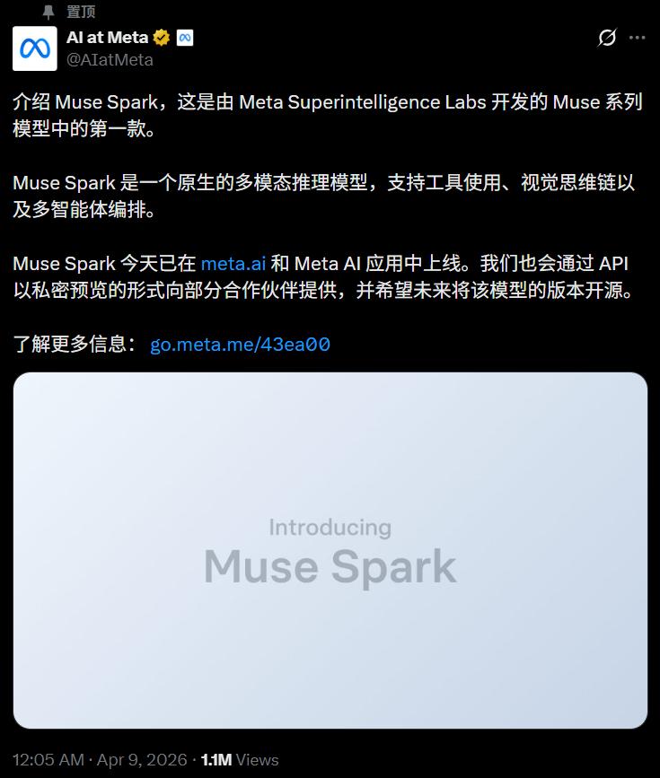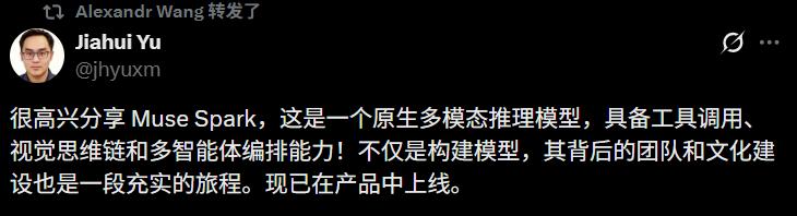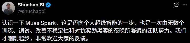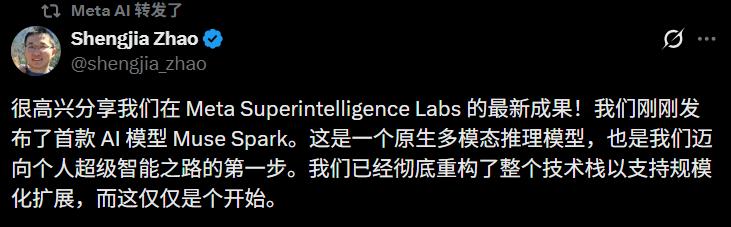 九个月前我们从零重建了整个AI技术栈,新基础设施、新架构、新数据管线。Muse Spark就是这些工作的成果。