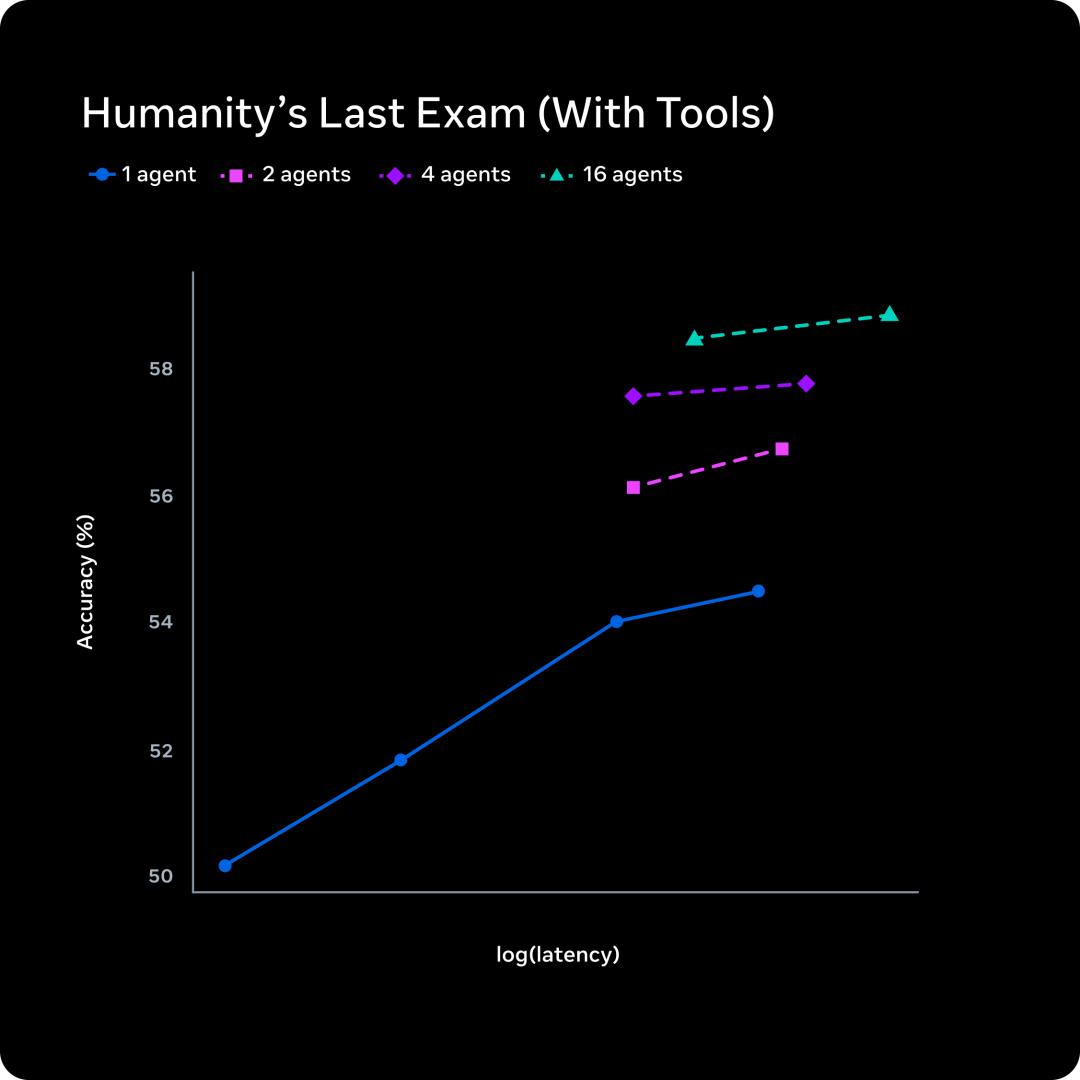 Meta的做法是扩展并行Agent数量,1个、2个、4个、16个Agent同时思考。