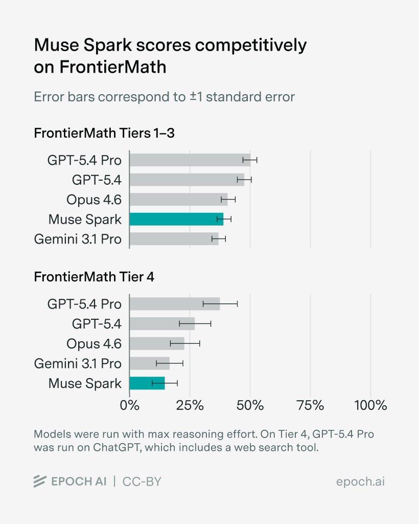 此外,在由数学大佬出题的FrontierMath上, Muse Spark在1-3层级上,直接碾压Gemini 3.1 Pro,不过在4层级却排在了倒数。