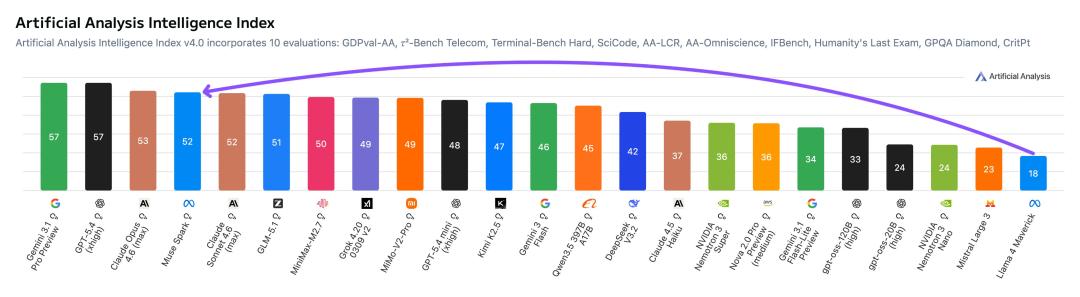 在Artificial Analysis的测试中,Muse Spark拿下了高达52分的战绩,仅次于Gemini 3.1 Pro、GPT-5.4和Opus 4.6。
