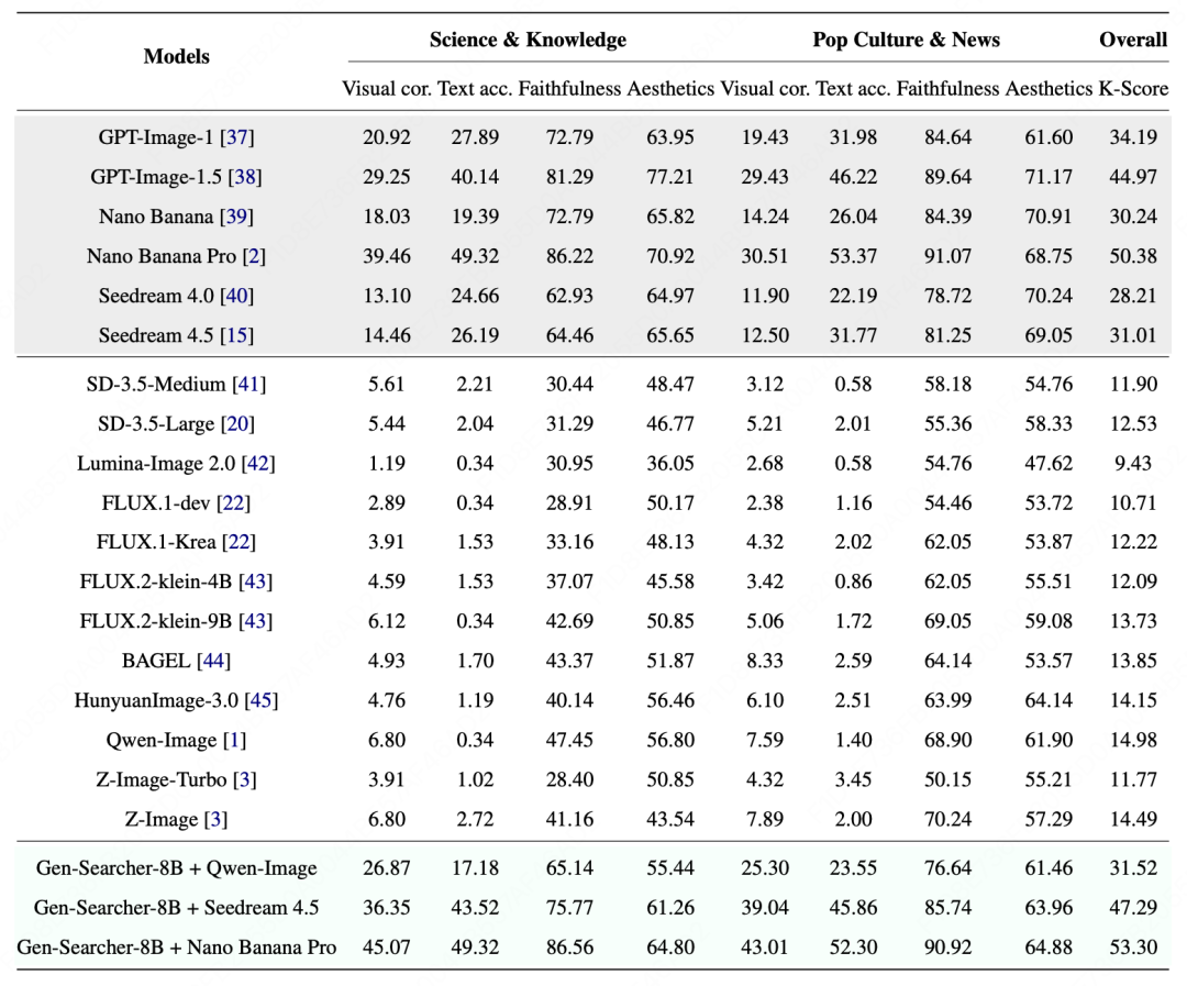 在 KnowGen 上,原始 Qwen-Image 的 K-Score 为 14.98,接入 Gen-Searcher-8B 后提升到 31.52,提高 16.54 分。而且这种能力还能迁移到其他图像生成器上:Seedream 4.5 从 31.01 提升到 47.29,Nano Banana Pro 也从 50.38 提升到 53.30。