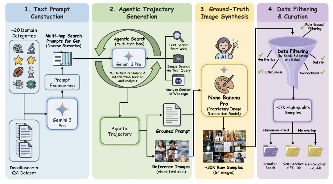 随后,作者让强模型配合搜索工具生成多轮轨迹,收集文本知识和视觉证据,再用 Nano Banana Pro 合成目标图像,得到约 30k 条原始样本。经过 Seed1.8 筛选后,最终保留约 17k 条高质量数据,并整理成 Gen-Searcher-SFT-10k 和 Gen-Searcher-RL-6k。