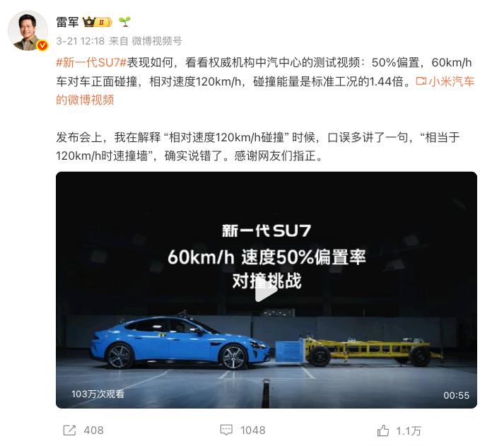 比如雷军在新一代SU7上市发布会上提到:「50%偏置,60公里每小时,车对车正面碰撞,两辆车都是60km/h,相当于你开120km/h撞到墙上。」最后的一句话并没有出现在PPT上,只是雷军本人顺嘴说了出来。