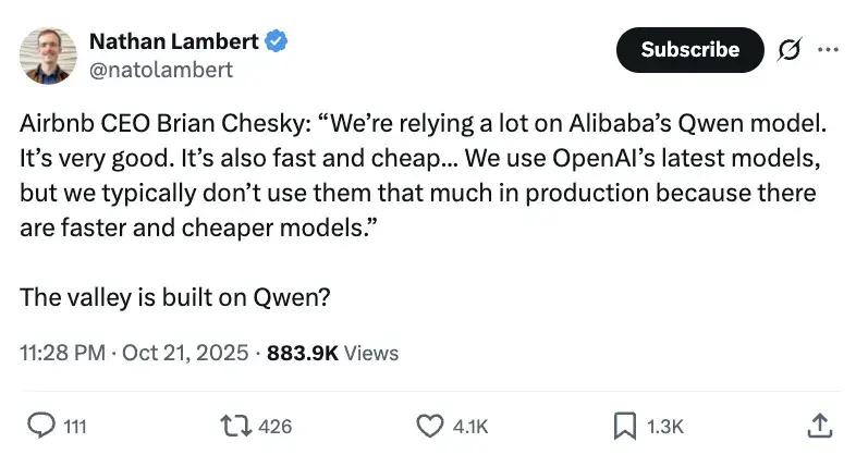 Shopify因切换至Qwen,每年节省500万美元;爱彼迎联创Brian Chesky也曾表示:Qwen又好又快又便宜,比GPT还好用!