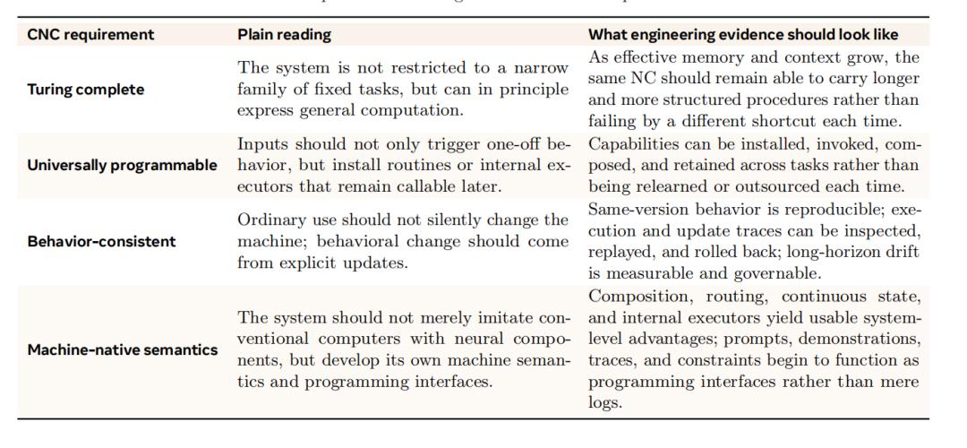 作为这一概念的长期目标,完全神经计算机(CNC)是神经计算机的成熟形态,它必须满足图灵完备、通用可编程、行为一致性以及拥有机器原生语义这四个严苛条件。