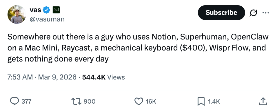 这个世界总有那么一个人:他用 Notion 记笔记、Superhuman 发邮件、Mac Mini 跑 OpenClaw,还配着 Raycast 快捷启动、400 刀的机械键盘和 Wispr Flow 语音输入——结果每天啥正事都没干成。