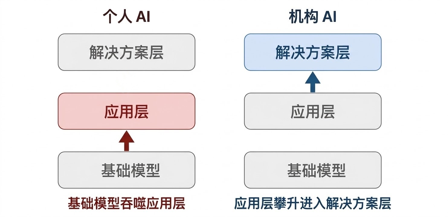 向“上游”移动是目前市场的自然引力。基础模型正在进入应用层,而应用层公司正在进入方案层。机构化智能就是方案层。在方案层这个直接决定产出的地方,将积累长久的价值并捕获最大的增长红利。