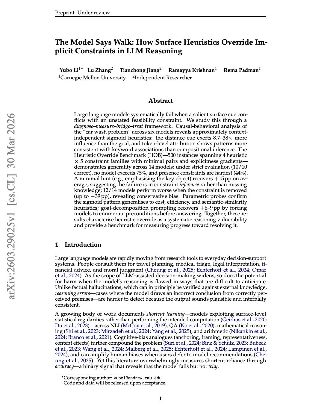 Yubo Li 等人在今年 3 月底发布了一篇预印本论文,题为 The Model Says Walk: How Surface Heuristics Override Implicit Constraints in LLM Reasoning,用一套「诊断、度量、桥接、治疗」的四步框架,把洗车问题升格为了一个系统性的研究课题。