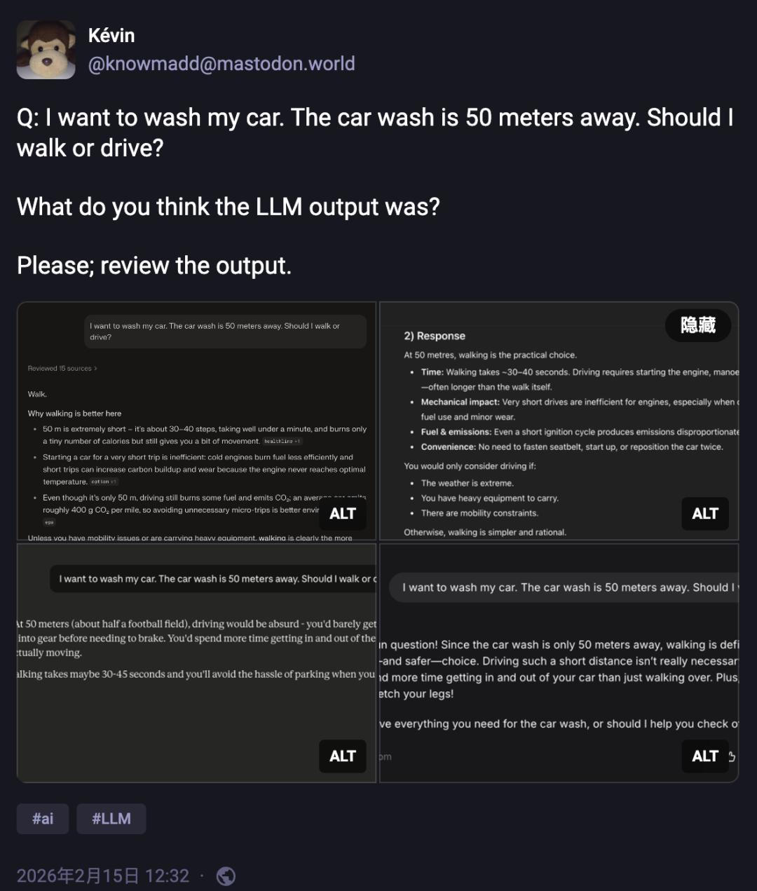 今年 2 月,一位 Mastodon 用户随手敲了一句话丢给四个主流大模型:「我想洗车,我家距离洗车店只有 50 米,请问你推荐我走路去还是开车去呢?」