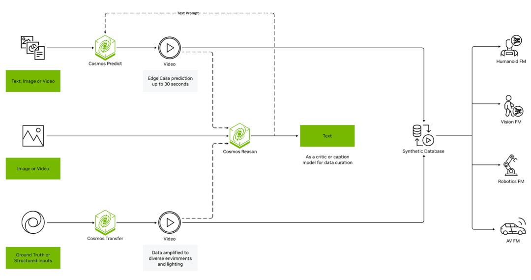 最后是最关键的三种预训练模型家族:负责预测环境未来状态的预测模型 Cosmos Predict、将模拟迁移到真实的仿真模型 Cosmos Transfer,以及负责让机器人做规划的推理模型 Cosmos Reason。这些预训练模型都通过开放许可证发布,开发者可以免费下载。
