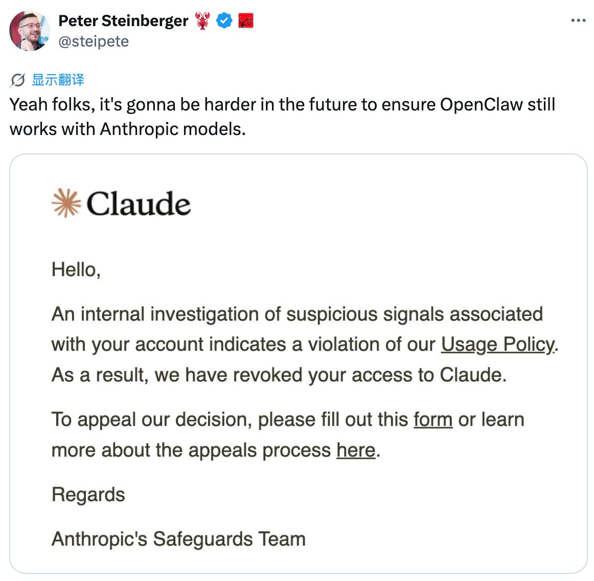 近期,OpenClaw 创始人 Peter Steinberger 在自己的社交账号抱怨,不知出于何种原因,自己的 Claude 账号一度因可疑活动被暂停,随后才恢复使用。Claude “爱封号”这件事几乎所有 AI 玩家都有所了解,但这次可不像是 Anthropic 无厘头发疯,更可能是因为在几天前,Anthropic 刚刚调整规则,收紧了 OpenClaw 这类第三方 Agent 对 Claude 订阅额度的调用方式。