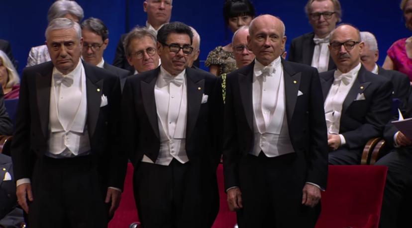 2025年诺贝尔经济学奖授予经济学家乔尔·莫基尔、菲利普·阿吉翁和彼得·豪伊特(右)。图片来源:诺奖官网视频截图