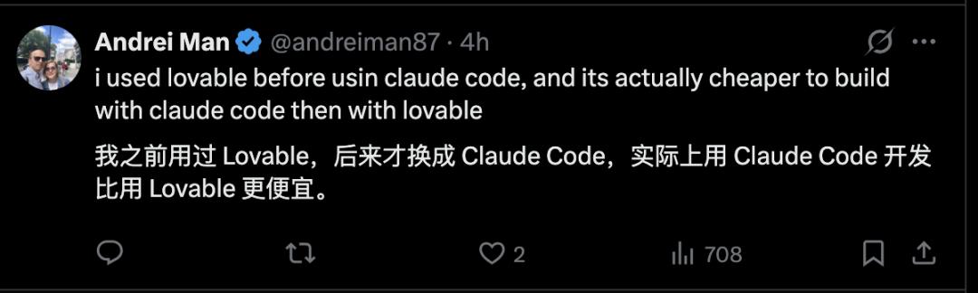 也有网友表示自己之前用过 Lovable,后来换成了 Claude Code,结果发现实际上用 Claude Code 开发比用 Lovable 更便宜。