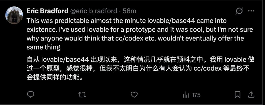 有用户表示,Lovable 这类应用做原型很棒,但未来 Claude Code 和 Codex 也终将会提供类似的功能,一切只是时间问题。