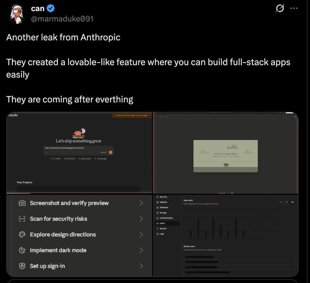近日,x 上 ID 名为 @marmaduke091 的网友爆料,继 Claude Code 源代码泄漏后,Anthropic 又发生了一次泄露——他们创建了一个类似 Lovable 的功能,让用户可以轻松构建全栈应用。他们正在追赶一切。