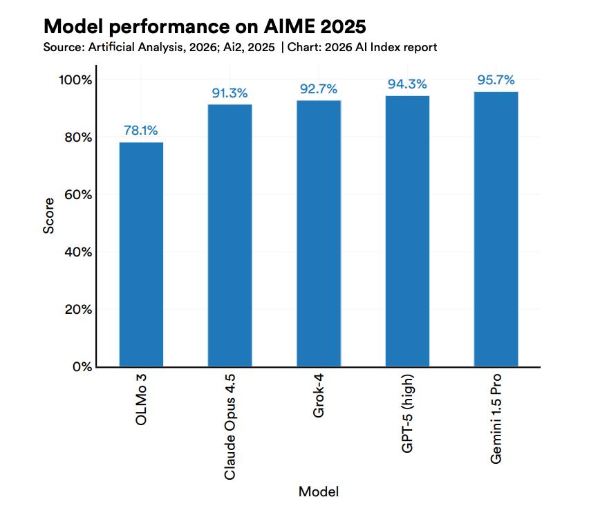 过去一年,全球超90%的顶尖模型,在博士级科学问题、多模态推理、竞赛数学上的表现,追平甚至超越了人类。