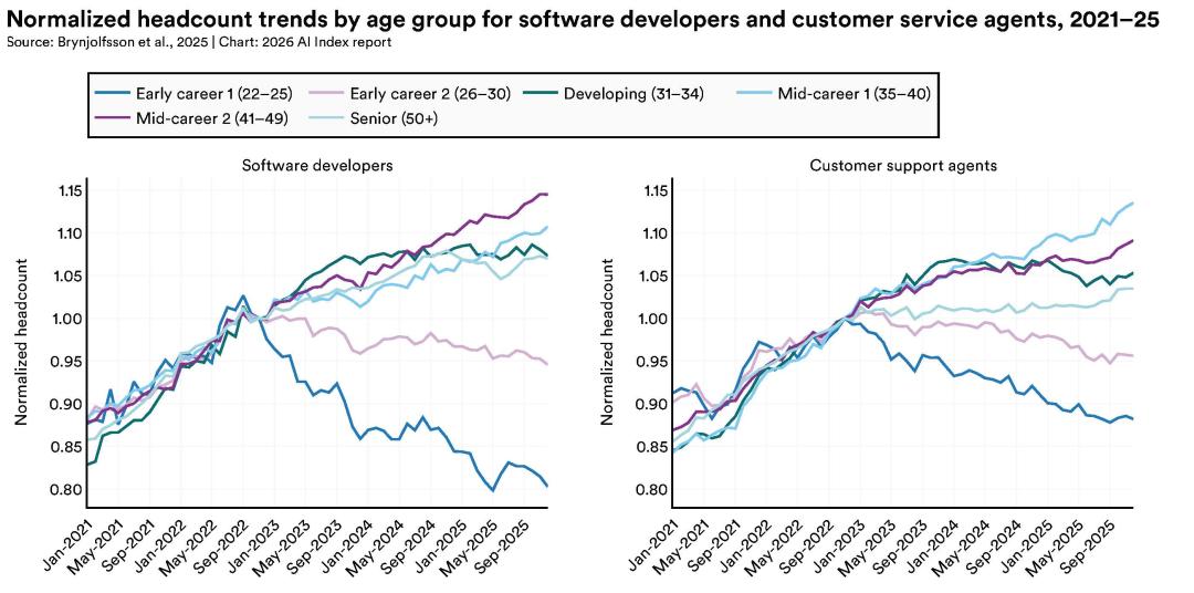 整份AI Index里最让中文读者沉默的,可能是关于年轻就业的部分。