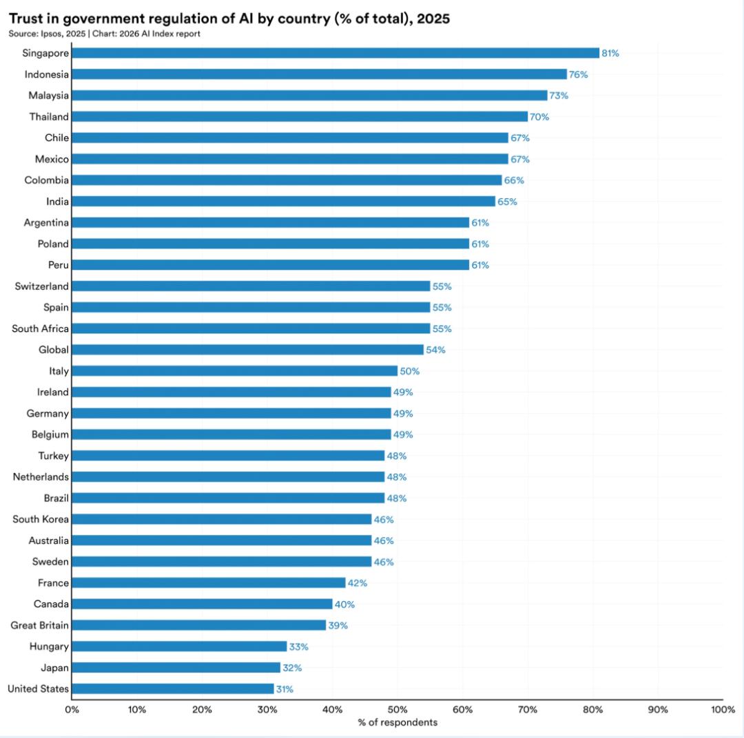 信任层面,不同国家之间,对政府监管AI的信任度差异明显。