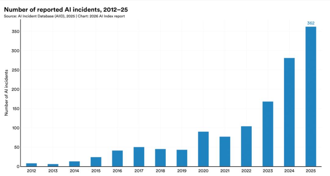 被记录在案的AI事件数量,从2024年的233起,上升到了362起。