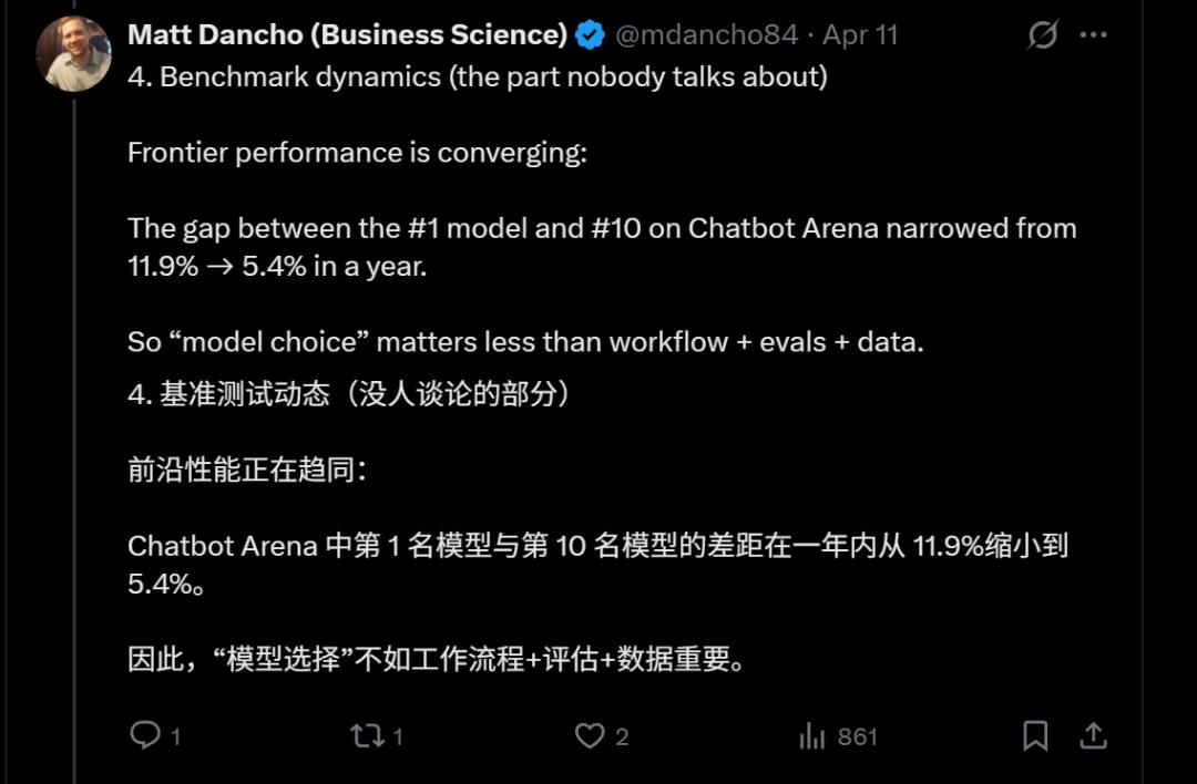 中美AI模型性能差距已基本消除(effectively closed)。