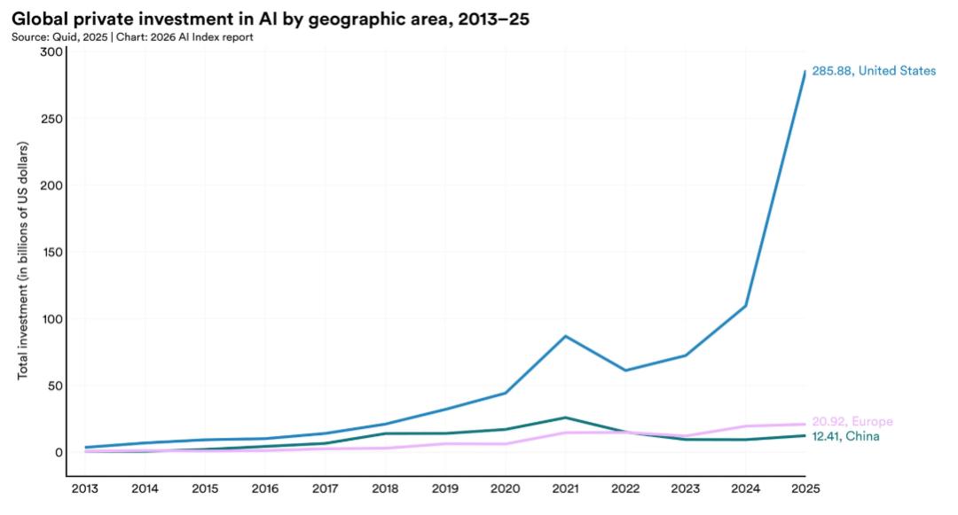 2025年,美国在AI上的私人投资达到2859亿美元,规模是中国124亿美元的23倍以上。