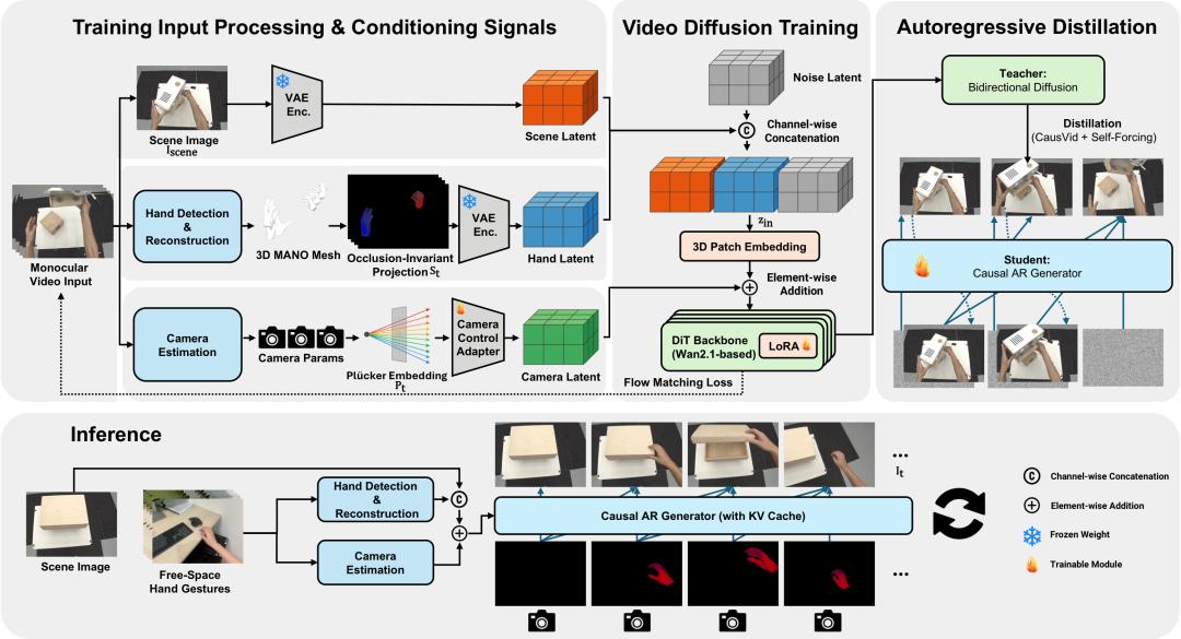 Hand2World将双向扩散教师模型蒸馏为因果自回归生成器,通过 KV cache 维持时序连贯,支持流式输出。这使得整个系统形成闭环——用户边看边调整手势,模型持续响应,交互可以无限进行下去。