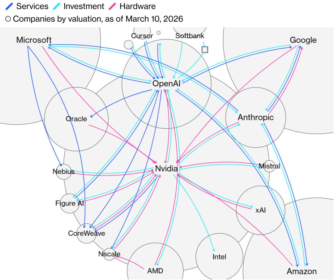 图3 AI产业链上企业间的循环交易情况 数据来源:Bloomberg。数据截至2026年3月10日