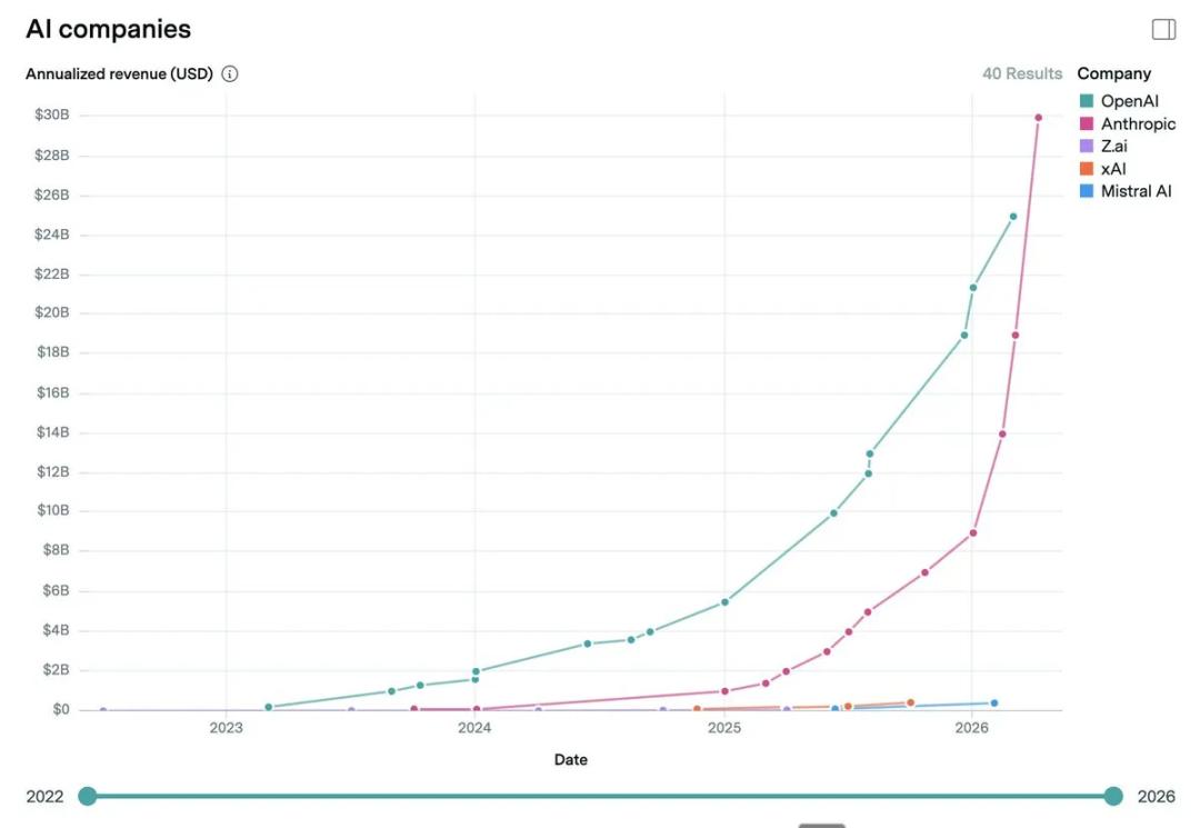 这一缺口的直接体现是,头部模型企业的亏损比收入扩张得更快。根据The Information数据,2026年2月,OpenAI和Anthropic的年化收入分别约为250亿美元和140亿美元,但随后Anthropic 4月份公布的年化收入已增长至300亿美元 (图2) ,反超OpenAI,收入增长迅猛。
