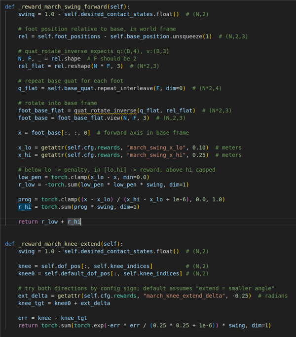 这一次,我们设计了 3 个新的奖励函数来让它走得更有难度:机器人的腿离地面过近、膝盖弯曲的角度不对、每步走得太短都不行。