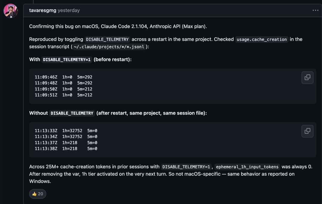GitHub里,Claude Code用户贴出真实日志:开启telemetry时,ephemeral_1h_input_tokens轻松破3万;一关telemetry,1h直接归零,全走5m缓存。同一段代码,缓存miss率直接飙12倍。